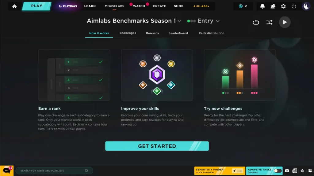 Benchmarks include three tiers: Entry, Intermediate, and Elite. Start with Entry. You will run tasks across different aim subcategories such as micro flicking, reactive tracking, and speed switching. These results show your strengths and weaknesses. If you learn that precise tracking holds you back, look for tasks or playlists that focus on that skill. Run the Benchmarks again later to measure progress.