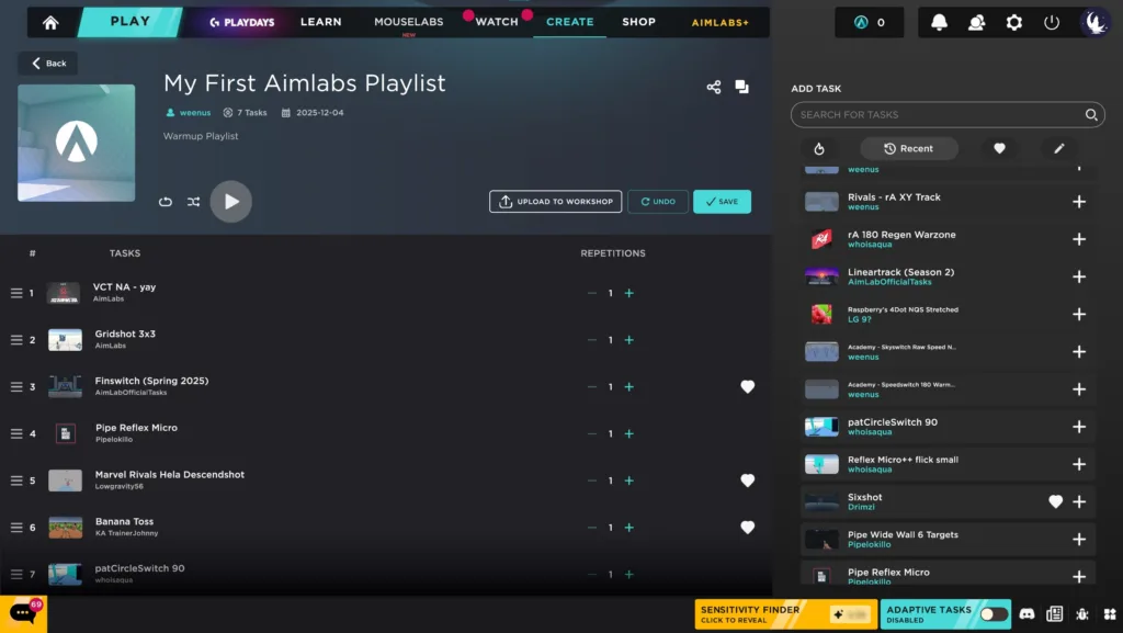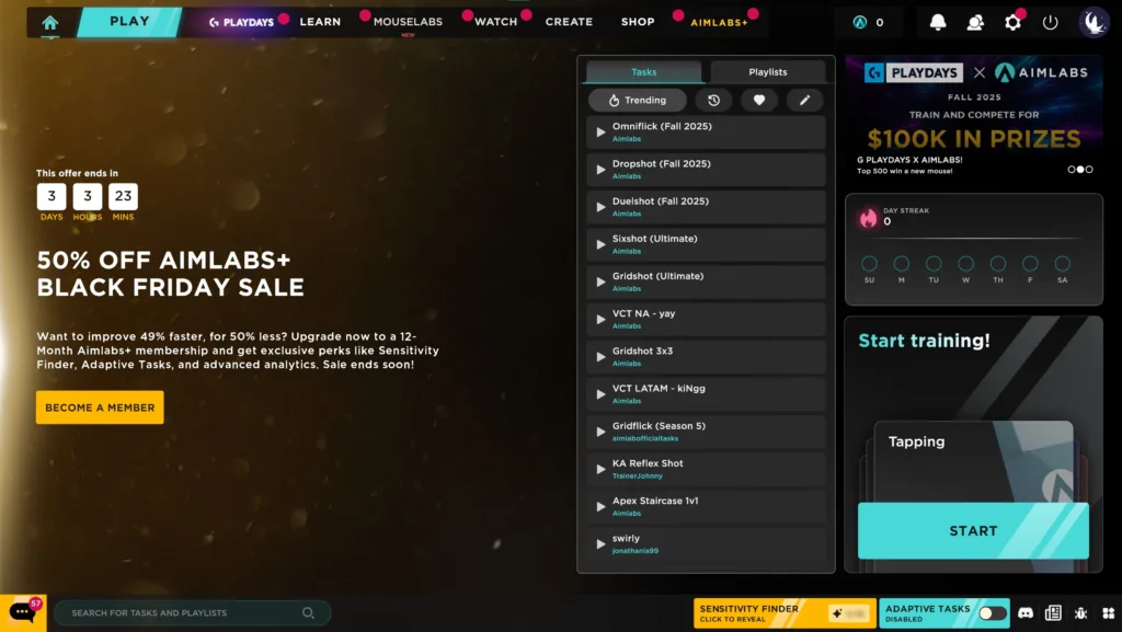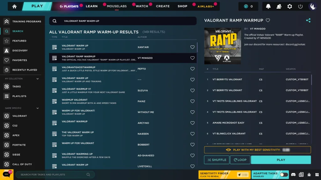 If you want something specific, use the Search Bar in the bottom left corner. You can also click Play in the top left corner, then select Training. Training Programs give you curated playlists for each game or aim category. These use Adaptive Tasks to match your skill level.