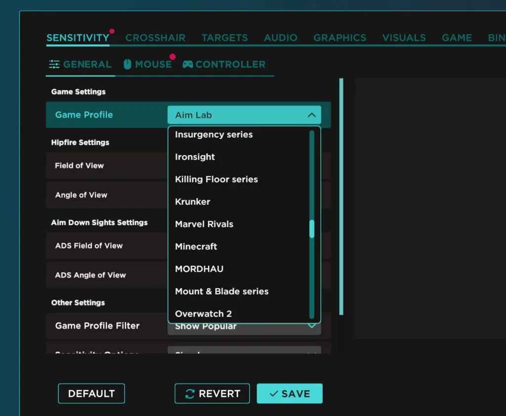 The onboarding process covers popular shooters, but your game might not appear on that list. You still have a wide set of Game Profiles. These profiles also work as a sensitivity calculator. You enter your current sensitivity for a game like Counter Strike 2, then switch the profile to something like Marvel Rivals. Aimlabs handles the calculation for you.
