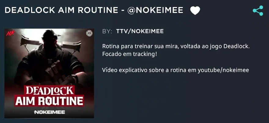 Rounding out today’s list is something a little different, a quick, tracking heavy playlist created by streamer and competitive player nokeimee. nokeimee put together a video breaking the routine down, check it out if the language barrier isn’t a problem! This playlist should run you less than 10 minutes, so you can run it back to back for some reps as a warm-up routine! Click Here to Play nokeimee’s Deadlock Aim Routine!