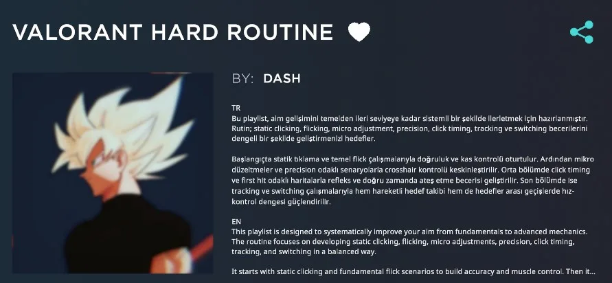 Another well designed tac shooter focused playlist with a decent balance of high quality tasks, built around advanced players developing their fundamentals. Dash has actually created several playlists, including Mid and Beginner focused routines, but this version is the one that is putting up the numbers, both in plays, and in inspiring remixes and copied versions. Expect this playlist to take a little over 30 minutes to complete. Click Here to Play the VALORANT Hard Routine!